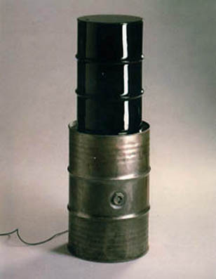 "Noir et blanc", 1987 fûts métalliques, huile de vidange, pompe électrique, 165 x 59 cm Collection FRAC Alsace