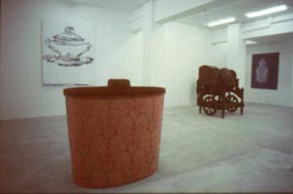 au premier plan "La baignoire de l'Opéra Comique", 1992 bois, tissus, bronze, garniture de tapissier, 180 x 166 x 146 cm Collection FRAC Lorraine